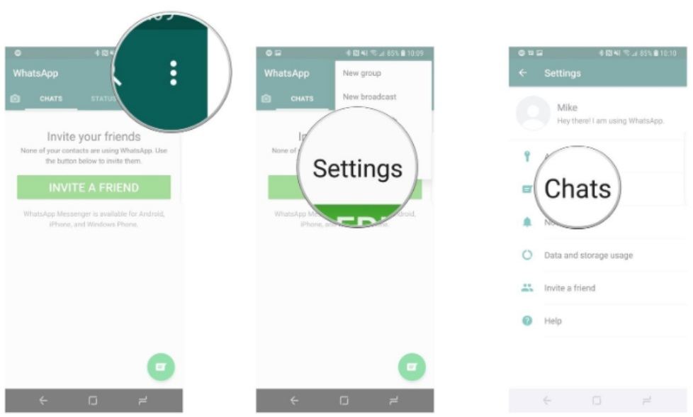 -برای تهیه پشتیبان از چتهای واتس اپ در ایمیل، کافیست وارد صفحه چت شده و با انتخاب آیکن سه نقطه و ورود به بخش More، روی گزینه Export Chat اشاره کنید. در این صورت میتوانید تمام محتوای گفتگو (شامل فایلها) را به ایمیل خود بفرستید.