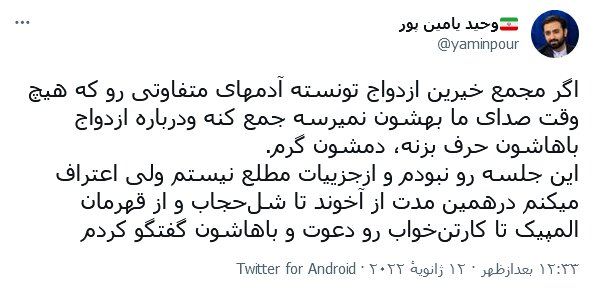 به گزارش ایسنا، وحید یامین پور نیز در صفحه شخصی خود در توییتر نوشت:« اگر مجمع خیرین ازدواج تونسته آدمهای متفاوتی رو که هیچ وقت صدای ما بهشون نمی‌رسه جمع کنه و درباره ازدواج باهاشون حرف بزنه، دمشون گرم.»