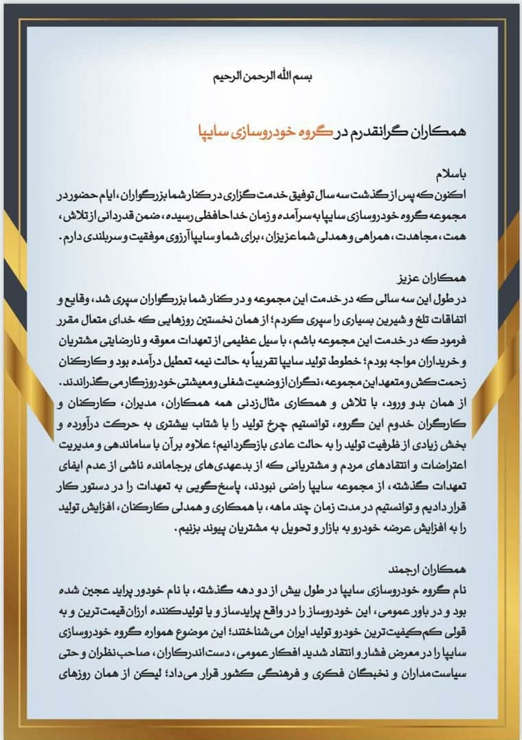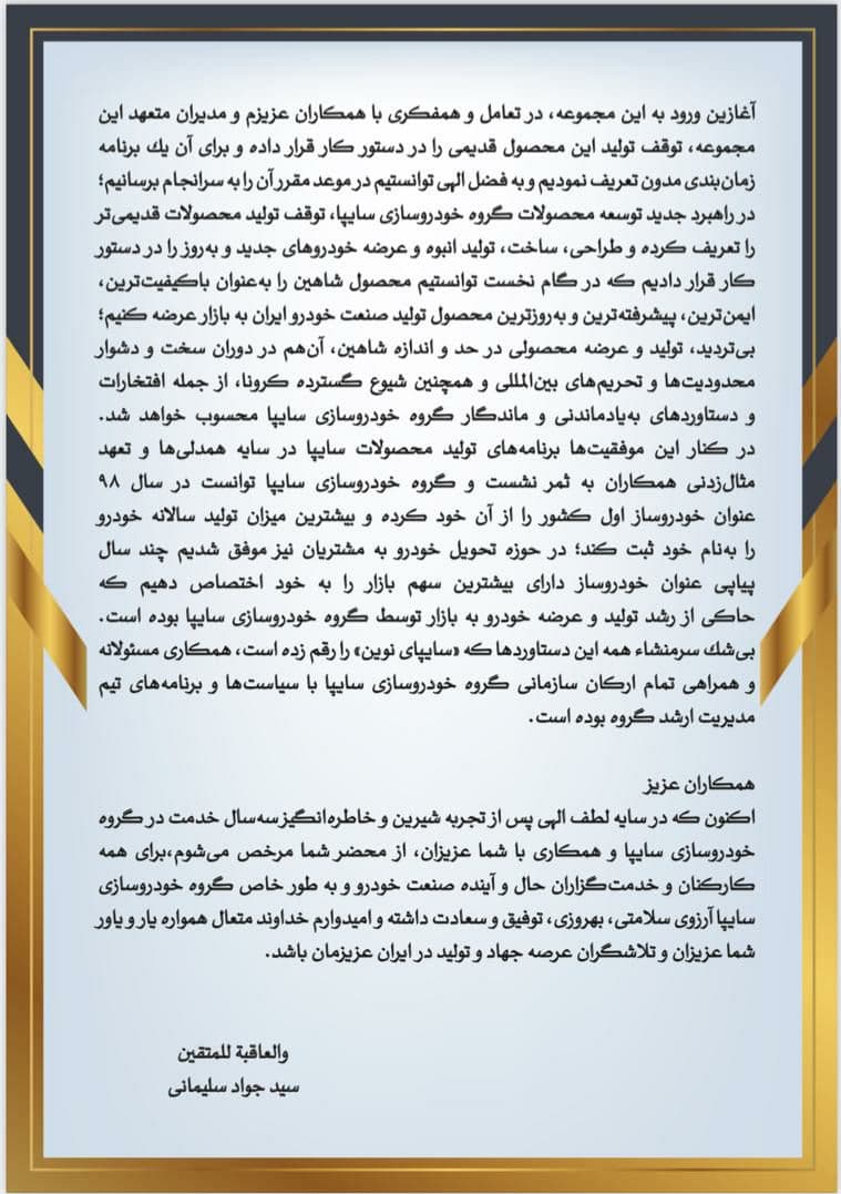 سید جواد سلیمانی امروز پس از ۳ سال فعالیت در سایپا از گروه خودروسازی سایپا خداحافظی کرد و محمدعلی تیموری مدیریت سایپا را به دست گرفت.