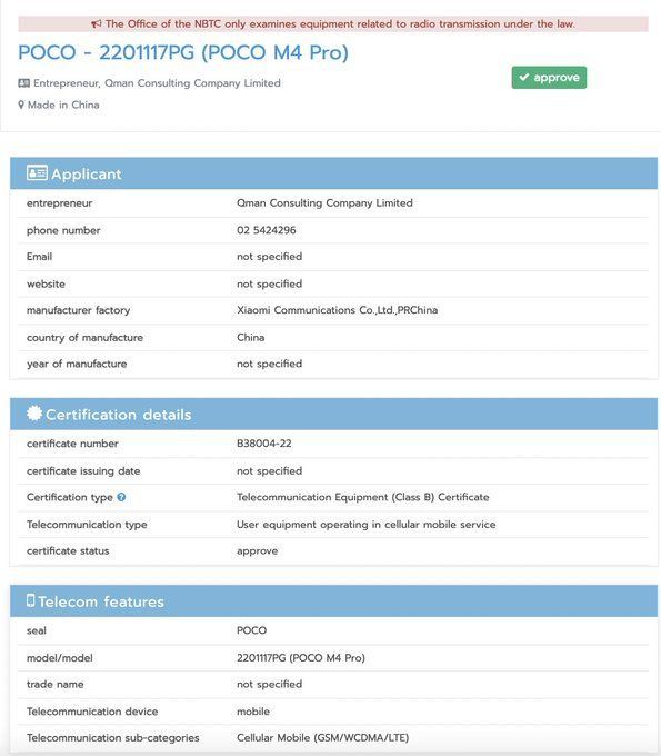 گوشی پوکو ام ۴ پرو 4G (POCO M4 Pro 4G) با شماره مدل 2201117PG توسط کمیسیون ملی صداوسیما و مخابرات تایلند (National Broadcasting and Telecommunications Commission) تأیید شده است. نسخه 5G این گوشی در نوامبر ۲۰۲۱ روانه بازار شد. احتمالاً نسخه 4G این گوشی بهزودی معرفی شود و ابتدا در بازار تایلند عرضه خواهد شد. در فهرست NBTC اطلاعات زیادی در مورد این گوشی دیده نمیشود و تنها به 4G آن اشاره شده است؛ البته خود شیائومی فهرستی از مشخصات یک گوشی با شماره مدل 2201117SI و کد نام ملی (Meli) منتشر کرده است.