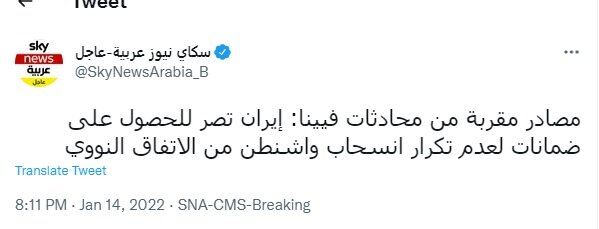 صفحه توئیتری اسکای نیوز عربی با انتشار خبری کوتاه دلیل طولانی شدن مذاکرات وین را اعلام کرد.