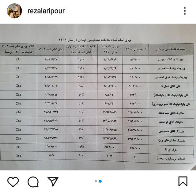 البته اخیرا مدیرکل روابط عمومی سازمان نظام پزشکی، جدولی را با عنوان "بهای تمام شده خدمات تشخیصی و درمانی در سال ۱۴۰۱" در صفحه اینستاگرامش منتشر و اعلام کرده که طی بررسیهایی، قیمت تمام شده خدمات از سوی سازمان نظام پزشکی احصاء و برای معاون ریاست جمهوری و رییس سازمان برنامه و بودجه ارسال شده است.