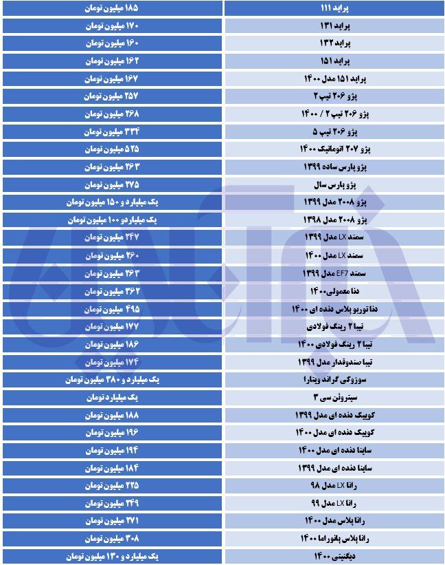 در بین خودروهای پژو مدل ۲۰۶ تیپ ۲ از ۲۵۸ میلیون تومان در چهارشنبه گذشته امروز به ۲۵۷ میلیون تومان رسیده است و پژو پارس نیز در این مدت یک میلیون تومان ارزان شده است و این خودرو در حال حاضر ۲۶۳ میلیون تومان قیمت خورده است.