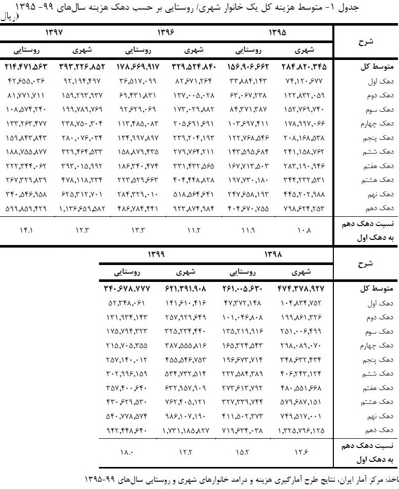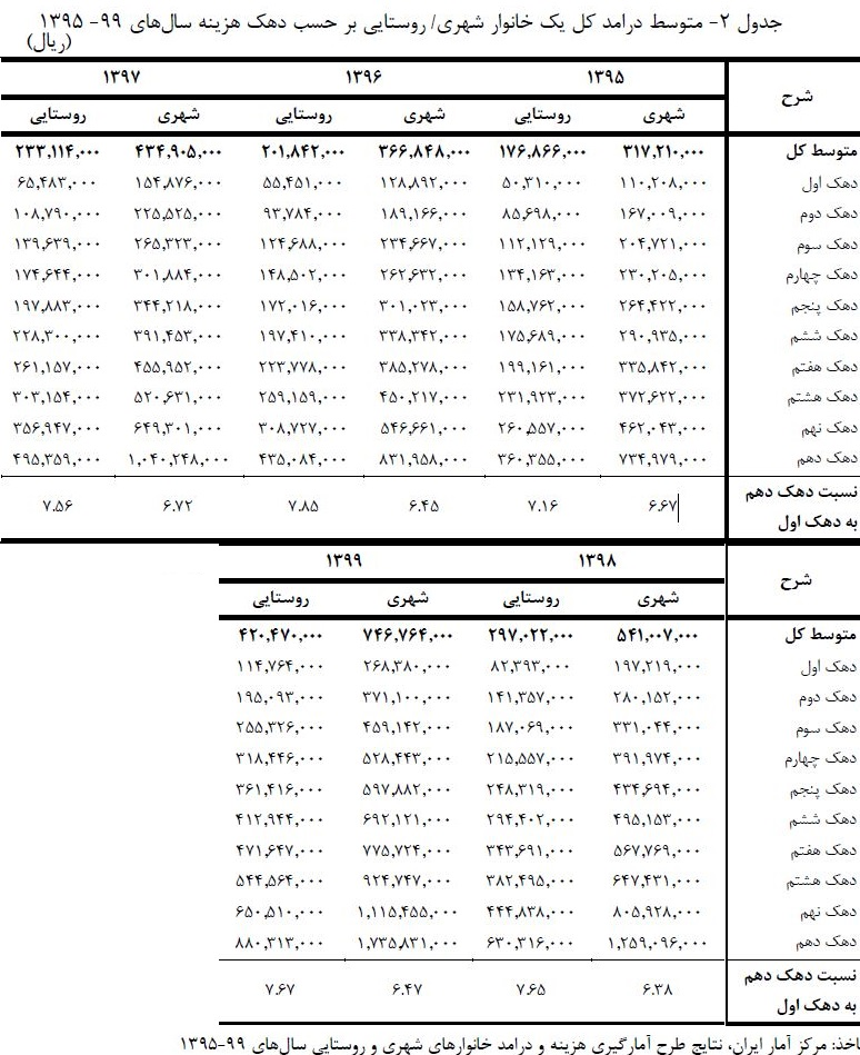 در مناطق روستایی نسبت درآمد کل یک خانوار در دهک دهم (ثروتمندترین) نسبت به درآمد کل یک خانوار در دهک اول (فقیرترین) از 7.1 برابر در سال 95 به 7.6 برابر در سال 99 افزایش یافت. این نسبت برای خانوارهای روستایی از خانوارهای شهری بالاتر است.