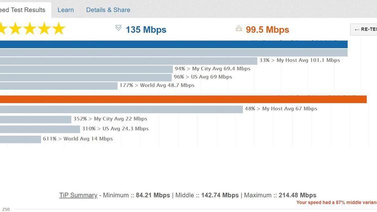 نتایج ساده هستند و سرعت دانلود شما را به صورت مگابیت بر ثانیه در اختیارتان قرار میدهد، البته میتوانید به اطلاعات بیشتری هم دست پیدا کنید. در همین راستا میتوانید به اطلاعاتی درباره سرعت آپلود و همچنین تاخیر هم دست یابید. شما همچنین قادر به تنظیم نحوه تست سرعت هم هستید که شامل تعداد اتصالات موازی و مدت زمان تست میشود.