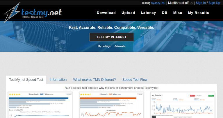 Testmy.net یکی دیگر از وب سایتهای اندازه گیری سرعت اینترنت است که روی HTML5 و PHP کار میکند. بنابراین نیازی به نرم افزارهای شخص ثالث مانند جاوا ندارید که میتواند باعث دستیابی به نتایج دقیقتر شود. همچنین میتوانید به راحتی از این وب سایت در مرورگرهای مختلف استفاده کنید. اگر در آینده به دنبال اطلاع از سرعت اینترنتتان در گذشته باشید یا بخواهید در گذر زمان سرعت اینترنت خود را مقایسه کنید، میتوانید در آن حساب بسازید.
