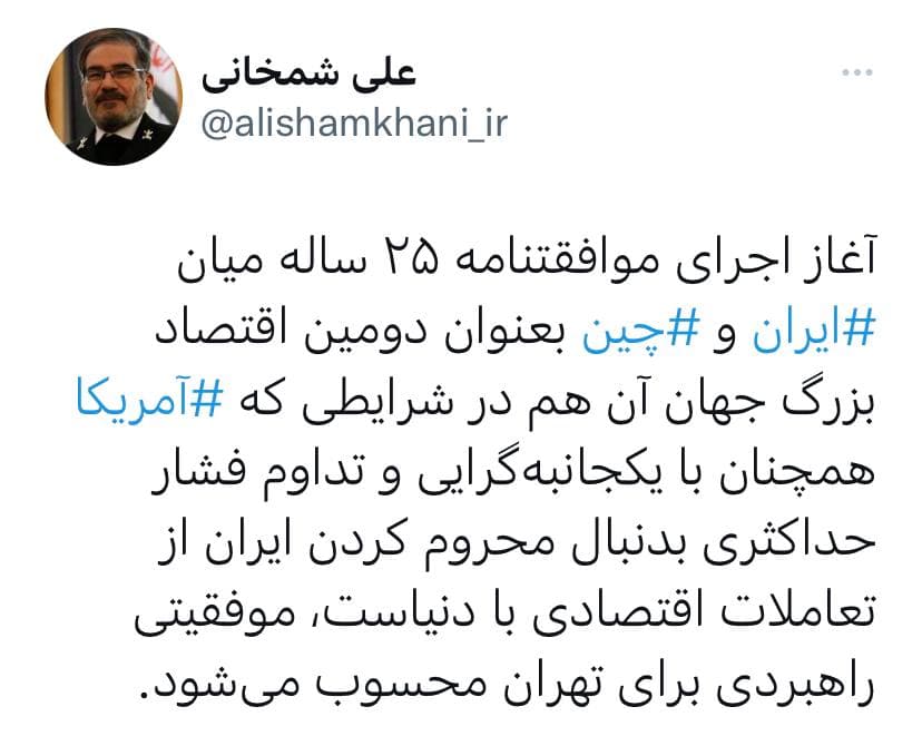 علی شمخانی در توییتی نوشت: آغاز اجرای موافقتنامه ۲۵ ساله میان ایران و چین به عنوان دومین اقتصاد بزرگ جهان آن هم در شرایطی که آمریکا همچنان با یکجانبهگرایی و تداوم فشار حداکثری بدنبال محروم کردن ایران از تعاملات اقتصادی با دنیاست، موفقیتی راهبردی برای تهران محسوب میشود.