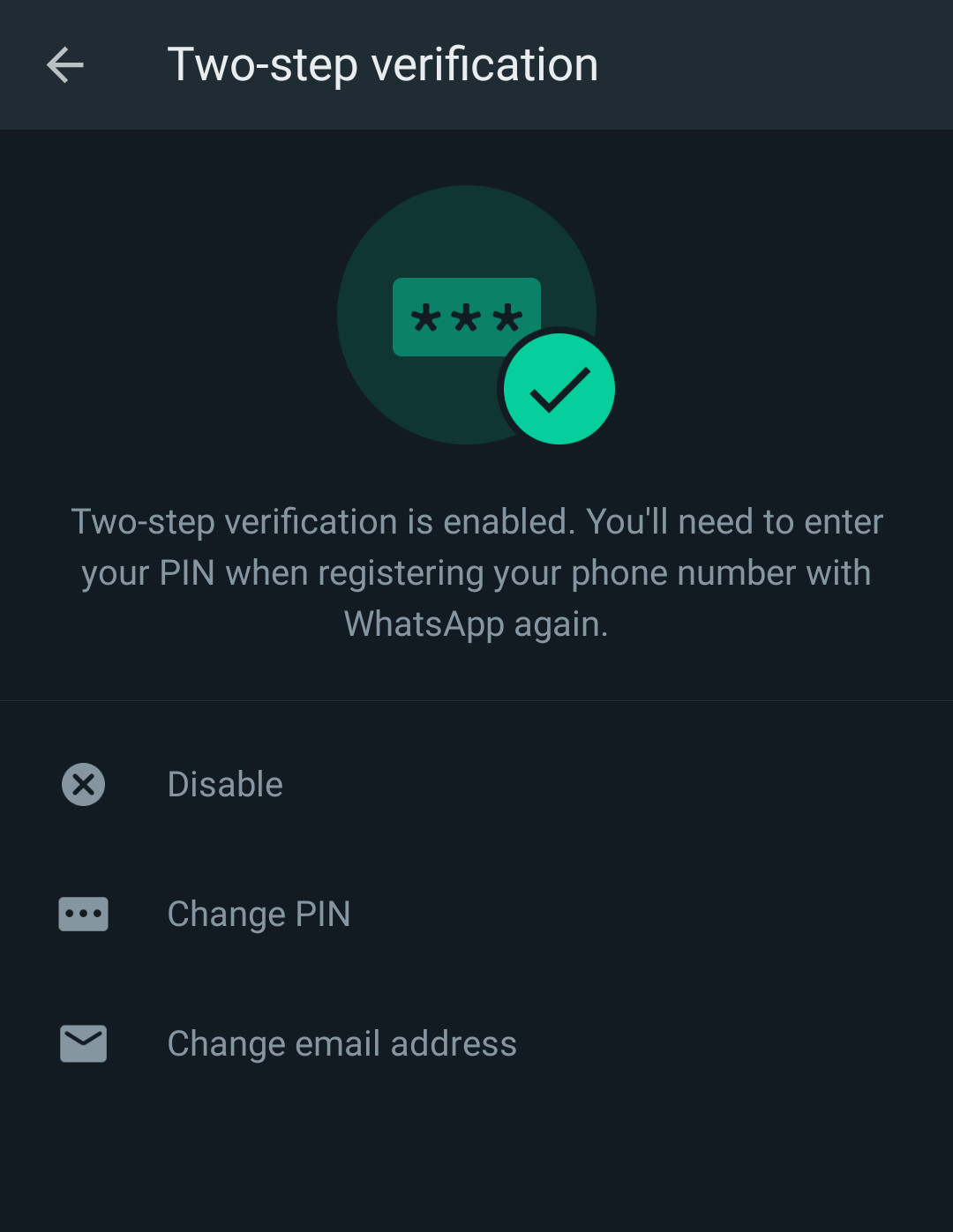 به لطف ویژگی تایید دو مرحلهای واتساپ، پس از وارد کردن کد ثبت نام ۶ رقمی، یک کد اضافی (به نام PIN) هنگام ورود به واتساپ مورد نیاز خواهد بود.