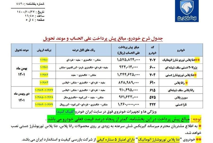 در این طرح تارا دستی، سورن پلاس، رانا پلاس و رانا پلاس با سقف شیشه‌ای، دنا پلاس توربوشارژ دستی و اتوماتیک و پژو 207 دستی سقف شیشه‌ای با موعد تحویل دی و بهمن 1401 عرضه می‌شود.