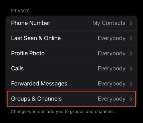 مرحله ۴. در تنظیمات حریم خصوصی و امنیت، روی گزینههای "گروهها و کانالها" در زیر تب Privacy ضربه بزنید.