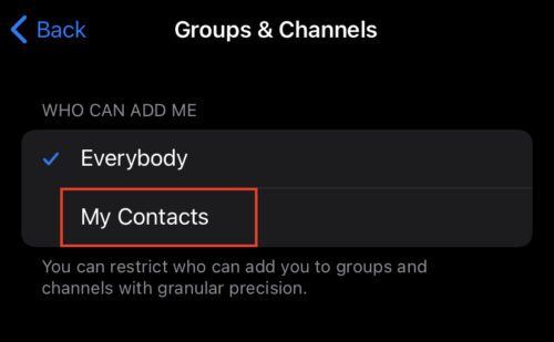 مرحله ۵. گزینه "My Contacts" را انتخاب کنید. با این کار فقط مخاطبین شما میتوانند شما را به کانال یا گروهی اضافه کنند.