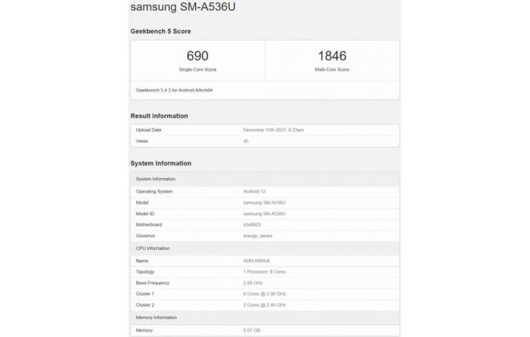 بنچمارکی که از گلکسی A53 5G با تراشهی اگزینوس ۱۲۰۰ منتشر شد