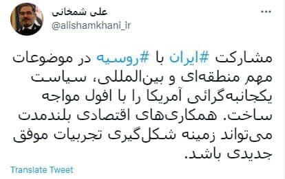 در توئیت علی شمخانی آمده است: مشارکت ایران با روسیه در موضوعات مهم منطقهای و بینالمللی، سیاست یکجانبهگرائی آمریکا را با افول مواجه ساخت. همکاریهای اقتصادی بلندمدت میتواند زمینه شکلگیری تجربیات موفق جدیدی باشد.