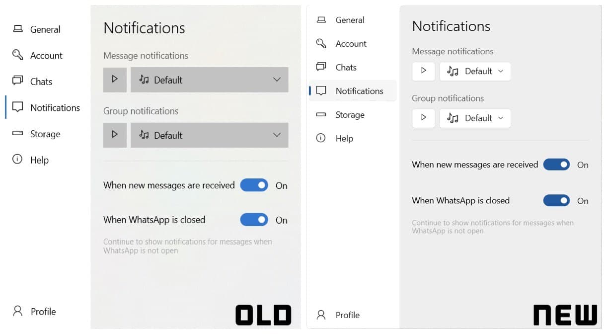 همانطور که در این تصاویر دیده میشود، دکمهها در نسخه جدید اپلیکیشن واتساپ برای ویندوز طراحی گردتری به خود گرفتهاند و همچنین منوهای کشویی و سایر علائم آن اکنون بیشتر از قبل با زبان طراحی ویندوز 11 مطابقت دارند. با این حال، نسخه جدید اپلیکیشن هنوز در حال توسعه است و به همین دلیل برخی عناصر موجود در این تصاویر همچنان بدون تغییر خاصی به نظر میرسند که قابل درک است.