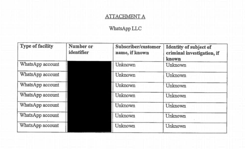 مجریان قانون در ایالات متحده تاکنون نیز با استفاده از روش مشابه، داده‌های کاربران واتساپ را ردیابی کرده‌اند و ظاهرا وزارت دادگستری برای توجیه ردیابی کاربران واتساپ تنها به وجود سه «اصل» نیاز دارد. هویت وکیل یا مامور اجرای قانون که درخواست را ارائه می‌کند، هویت سازمان ارائه‌دهنده درخواست و گواهی مبنی بر اینکه اطلاعات برای تحقیقات جنایی در حال انجام لازم است.
