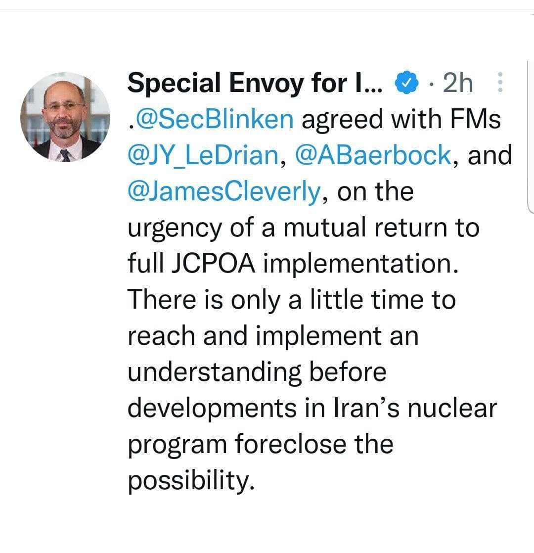 به گزارش سایت طلا، ​رابرت مالی در توییتی نوشت: بلینکن و وزرای خارجه فرانسه، آلمان و بریتانیا بر فوریت بازگشت کامل و دوجانبه به برجام توافق کرده اند. فقط زمان کمی برای رسیدن به تفاهم و اجرای آن وجود دارد قبل از آنکه پیشرفت برنامه هسته ای ایران راه هر امکانی را ببندد.