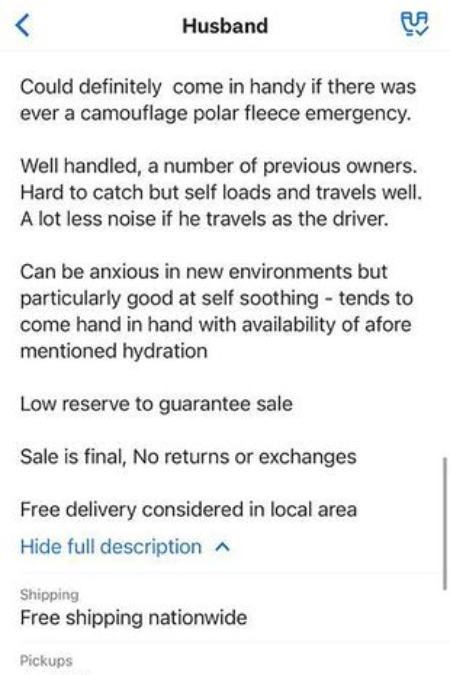 زنی در نیوزیلند شوهرش را در یک وبسایت حراجی به نام Trade Me به فروش گذاشت، پس از آنکه شوهرش بدون اطلاع قبلی به یک سفر ماهیگیری رفته او را با دو بچه مدرسه ایشان تنها گذاشت.