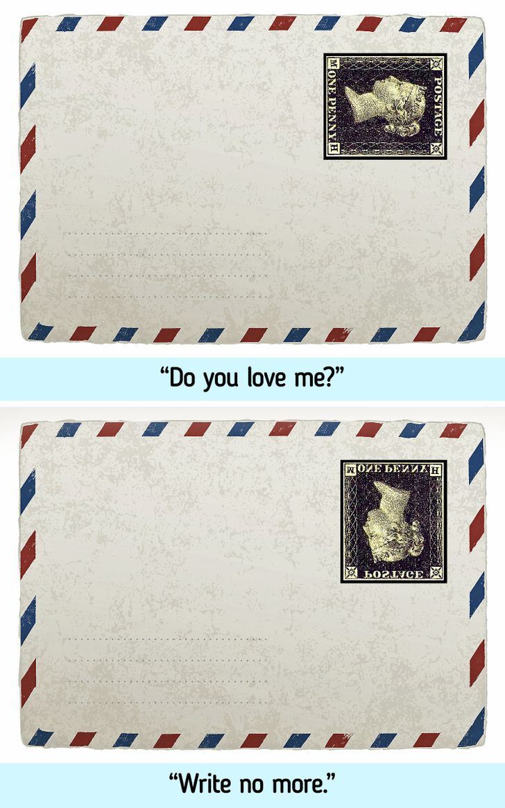 یک راه مخفیانهی دیگر برای برقراری ارتباط، استفاده از پاکت و تمبرهای پستی بود. محل چسباندن تمبر و اینکه در کدام گوشهی پاکت قرار گرفته باشد، میتوانست معانی زیادی داشته باشد. اگر تمبر گوشهی بالا راست پاکت چسبانده شده بود، معنایش این بود که آقا یا خانم ویکتوریایی از گیرندهی نامه میپرسید که به او علاقه دارد یا خیر. اما اگر تمبر در گوشهی پایین راست قرار گرفته بود، معنایش این بود که نویسندهی نامه مایل به گرفتن جواب نیست.