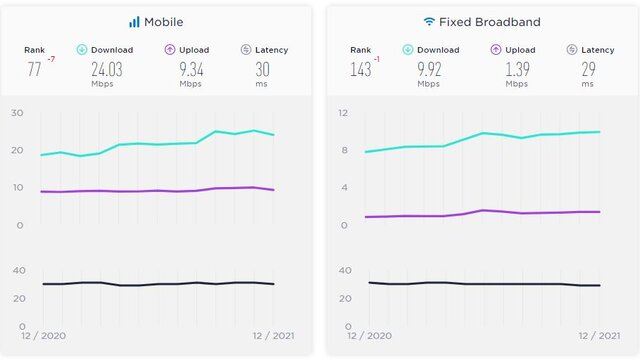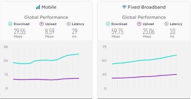 در حالی که تا ماه نوامبر سال ۲۰۲۱، میانه جهانی سرعت دانلود اینترنت موبایل، ۲۹.۰۶ مگابیتبرثانیه و میانه جهانی سرعت آپلود اینترنت موبایل، ۸.۵۳ مگابیتبرثانیه و تاخیر ۲۹ میلیثانیه بود. در حوزه اینترنت ثابت نیز میانه جهانی سرعت دانلود، ۵۸ مگابیتبرثانیه و میانه جهانی سرعت آپلود ۲۴.۲۷ مگابیتبرثانیه و تاخیر ۱۰ میلیثانیه بود.