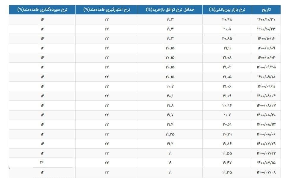 با توجه به دادههای سایت بانک مرکزی نرخ سود بین بانکی در تاریخ ۳۰ دی ۱۴۰۰ با کاهش ۰/۰۲ درصدی، به ۲۰/۴۸ درصد رسید.