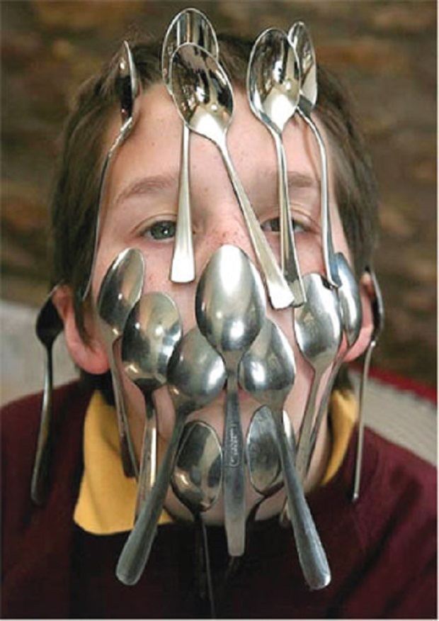 جوئی آلیسون انگلیسی در ۱۰ سالگی توانست ۱۵ قاشق فولادی ضد زنگ را روی صورتش نگه دارد. بد نیست بدانید چهار قاشق از این ۱۵ قاشق روی گوش و چانه جویی حفظ شده بود.