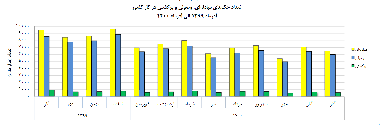 طبق آمار در آذرماه امسال ۵۴۴ هزار فقره چک به ارزش ۲۵۵ هزار میلیارد ریال برگشت داده شده است که نسبت به ماه قبل از نظر تعداد و مبلغ به ترتیب ۱۳.۶ درصد و ۱۶.۳ درصد کاهش یافته است.