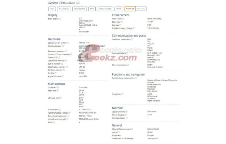 مشخصات فنی ریلمی ۹ پرو لو رفت