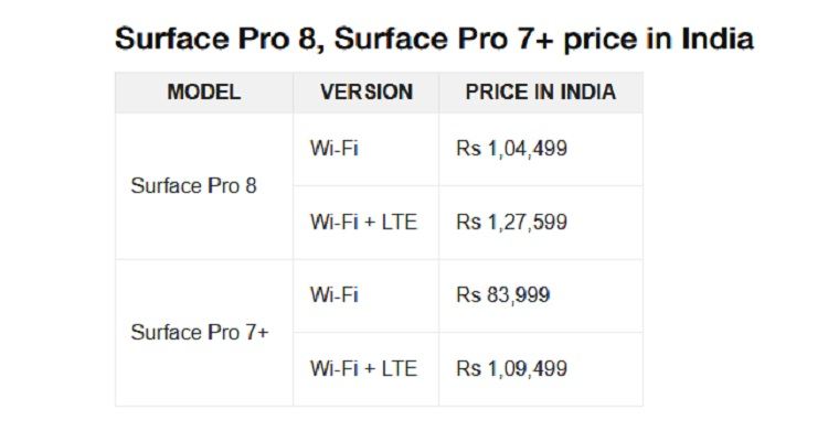 Surface Pro 8 در دو نوع (فقط وای فای) و(LTE) به ترتیب با قیمت ۱,۰۴,۴۹۹ روپیه و ۱,۲۷,۵۹۹ روپیه در دسترس خواهند بود. همچنین +Surface Pro 7 با قیمت ۸۳,۹۹۹ روپیه برای نوع فقط وایفای و ۱,۰۹,۴۹۹ روپیه برای گزینه LTE به فروش میرسد.