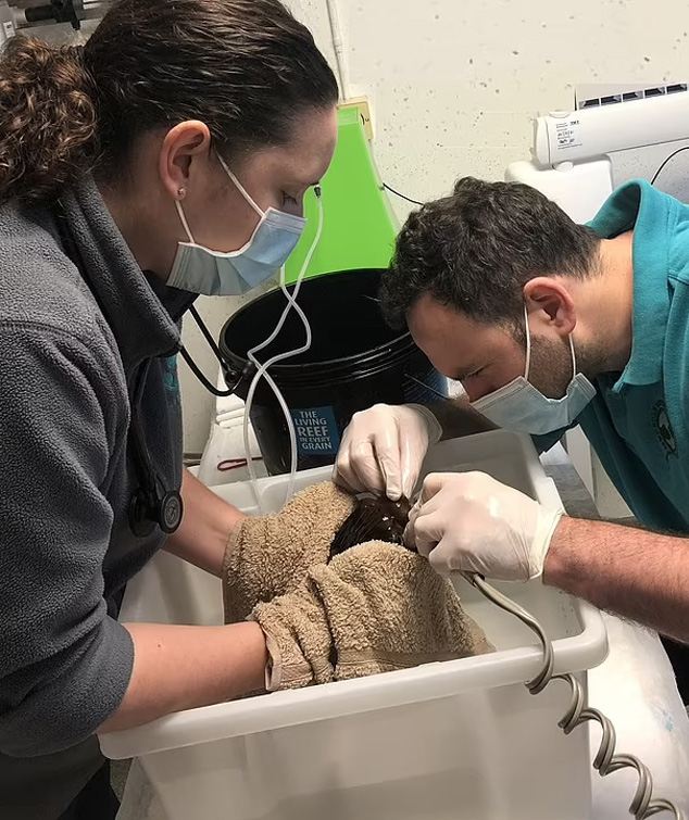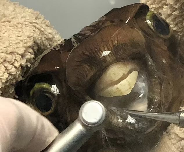 دامپزشکان از یک اره برای کوتاه کردن دندان های او استفاده کردند زیرا این ماهی پفی در معرض خطر گرسنگی بود.