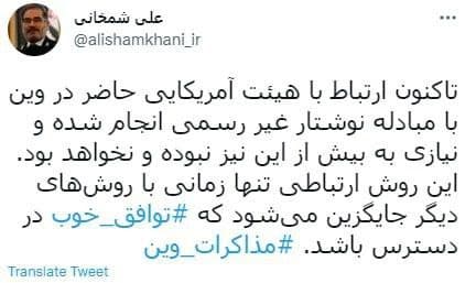 علی شمخانی در توییتی نوشت:تا کنون ارتباط با هیئت آمریکایی حاضر در وین با مبادله نوشتار غیر رسمی انجام شده و نیازی به بیش از این نیز نبوده و نخواهد بود. این روش ارتباطی تنها زمانی با روشهای دیگر جایگزین میشود که توافق خوب در دسترس باشد.
