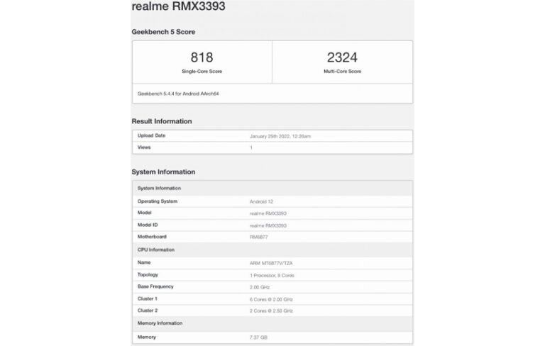 شماره مدل این گوشی با توجه به مشخصات گیک‌بنچ، RMX3393 است. طبق اطلاعات منتشر شده، این گوشی حداقل در مدلی که در گیک‌بنچ حضور پیدا کرد از ۸ گیگابایت حافظه‌ی رم بهره می‌برد. حال آیا در مدل دیگری با حافظه‌ی رم کمتر هم شاهد این محصول خواهیم بود یا خیر مشخص نیست. علاوه بر این‌ها، اندروید ۱۲ به عنوان سیستم‌عامل پیش‌فرض این گوشی و قطعا مدل‌های دیگر این سری ایفای نقش خواهد کرد.