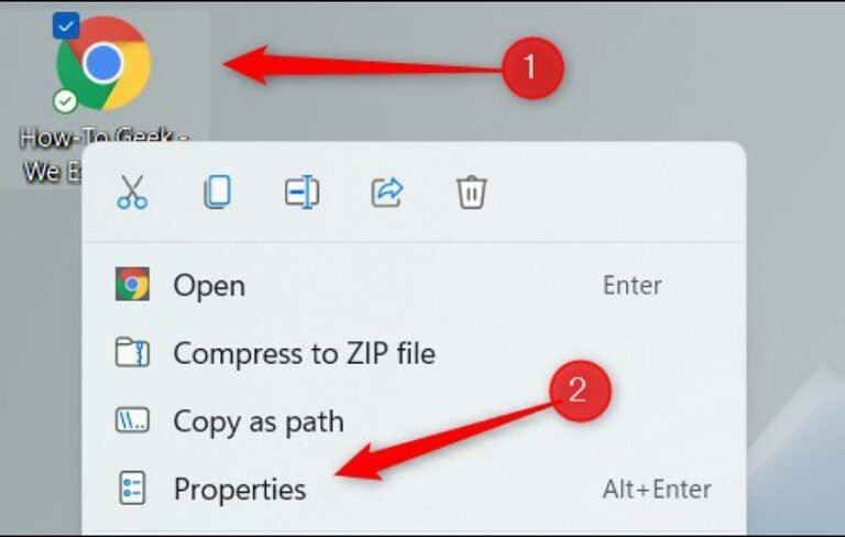 اکنون باید به این نشانک میانبر صفحه کلید جدیدی را اختصاص دهید. روی نماد دسکتاپ کلیک راست کرده و سپس از منوی زمینه روی «Properties» کلیک کنید. همچنین، میانبر دسکتاپ را انتخاب کنید و «Alt+Enter» را فشار دهید.