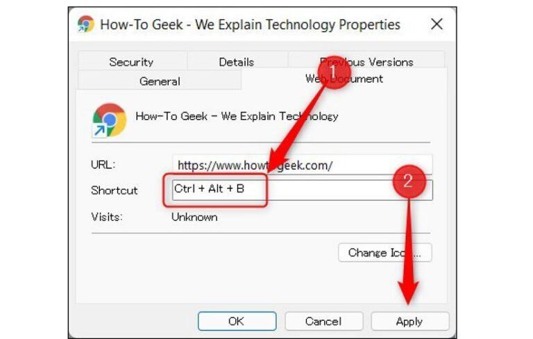 پنجرهی «Properties» ظاهر میشود. روی کادر متن «Shortcut» کلیک کنید و سپس کلیدی را که میخواهید به میانبر خود اختصاص دهید را تایپ کنید. به خاطر داشته باشید که «Ctrl+Alt» همیشه به میانبر شما اضافه خواهد شد. بنابراین، اگر حرف «B» را در اینجا فشار دهید، میانبر شما «Ctrl+Alt+B» خواهد بود.