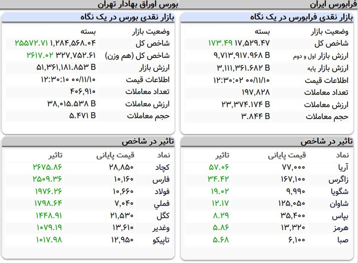 نمادهای پلیمر آریا ساسول (آریا)، پتروشیمی زاگرس (زاگرس)، پتروشیمی تندگویان (شگویا)، پالایش نفت لاوان (شاوان)، بیمه پاسارگاد (بپاس)، فولاد هرمزگان جنوب (هرمز) و شرکت سرمایه گذاری صبا تامین (صبا) تاثیر مثبت بر شاخص فرابورس همراه بودند.