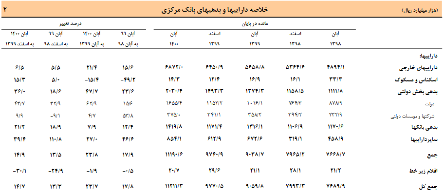 خلاصه دارایی خارجی بانک مرکزی در آبان امسال نسبت به اسفند سال گذشته ۶.۵ درصد رشد داشت.