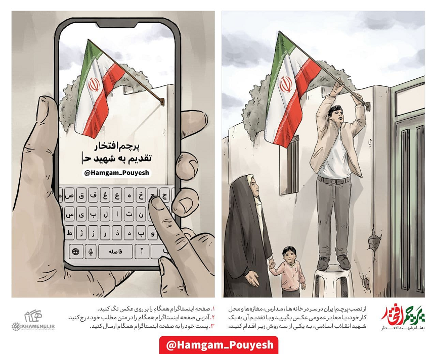 از نصب پرچم ایران در سر در خانهها، مدارس، مغازهها و محلکار خود، یا معابر عمومی عکس بگیرید و با تقدیم آن به یک شهید انقلاب اسلامی، به یکی از سه روش زیر اقدام کنید: