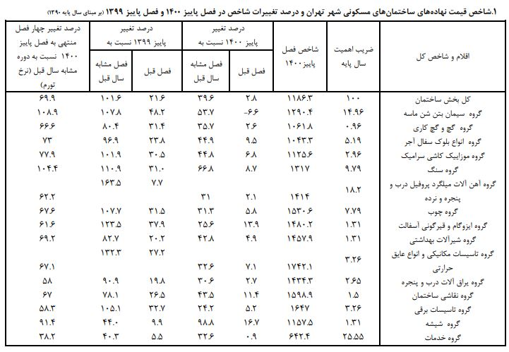 شاخص قیمت نهادههای ساختمانهای مسکونی شهر تهران در فصل پاییز ١٤٠٠ به عدد ١١٨٦,٣ رسید که این رقم نسبت به شاخص فصل قبل (١٠٧٦.٥)، ٢.٨ درصد افزایش داشته است.