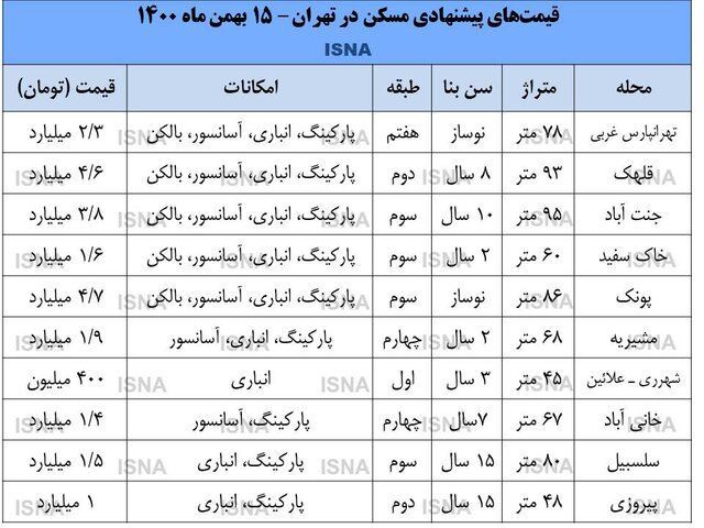 قیمت مسکن در شهر تهران از میانگین ۱۵ میلیون تومان در هر متر مربع شروع میشود و تا ۷۰ میلیون تومان میرسد. البته در آگهیها نرخهای پایینتر از متری ۱۵ میلیون تومان اغلب در جنوب تهران و بالاتر از متری ۷۰ میلیون تومان غالبا در شمال پایتخت دیده میشود.
