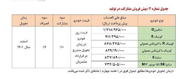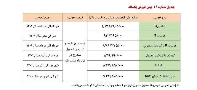 همچنین در طرح پیش فروش مشارکت در تولید محصولات گروه خودروسازی سایپا، 6 محصول یاد شده عرضه میشود و زمان تحویل این خودروها اسفند 1401 است.