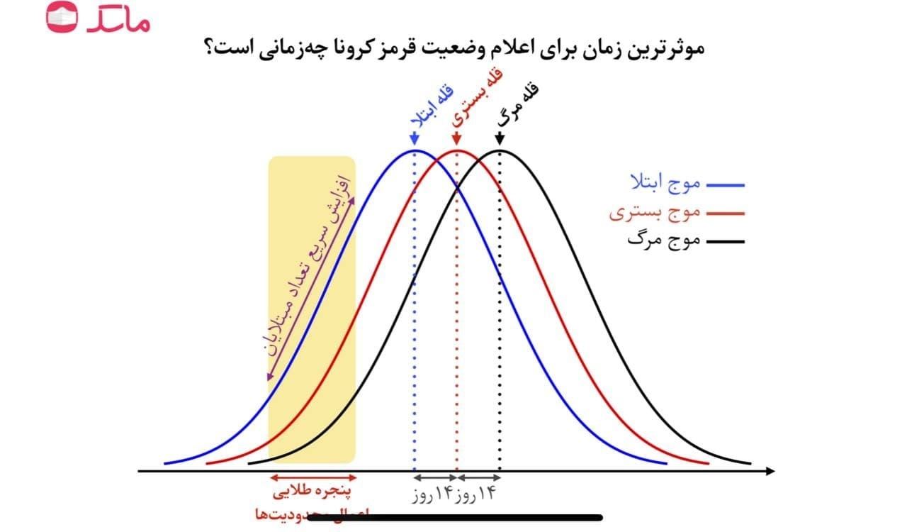 به گزارش سایت طلا، موثرترین زمان اعلام وضعیت قرمز، قبل از قله ابتلا، بستری یا مرگ است و بهترین زمــان اعلام وضعیت قرمز و اعمال محدودیتها، ابتدای پنجره طلایی در نمودار است؛ چرا که اعمال محدودیت در این زمان از سرعت افـزایش مبتلایان، پرشدن یکباره بیمارستانها، کاهش کیفیت خدمات درمانی به علت آمار بـالای مراجعـان، و درنتیجه، افزایش نسبت مرگ به ابتلا و بستری میکاهد.