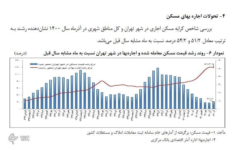 مرکز آمار اعلام میکند که نرخ تورم در بخش اجاره نسبت به ماه قبل، ۴.۴ درصد و نسبت دی ۹۹ حدود ۲۸.۶ درصد رشد داشته است. این درصد تورم در دهکهای مختلف جامعه نیز متفاوت گزارش شده است.