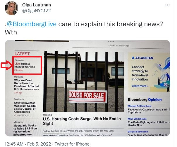به نوشته روزنامه «نیویورک پست»، این موسسه خبری آمریکایی حوالی ساعت چهار بعد از ظهر جمعه به وقت محلی در وبگاه خود این تیتر را قرار داد: «زنده: روسیه به اوکراین حمله کرد».