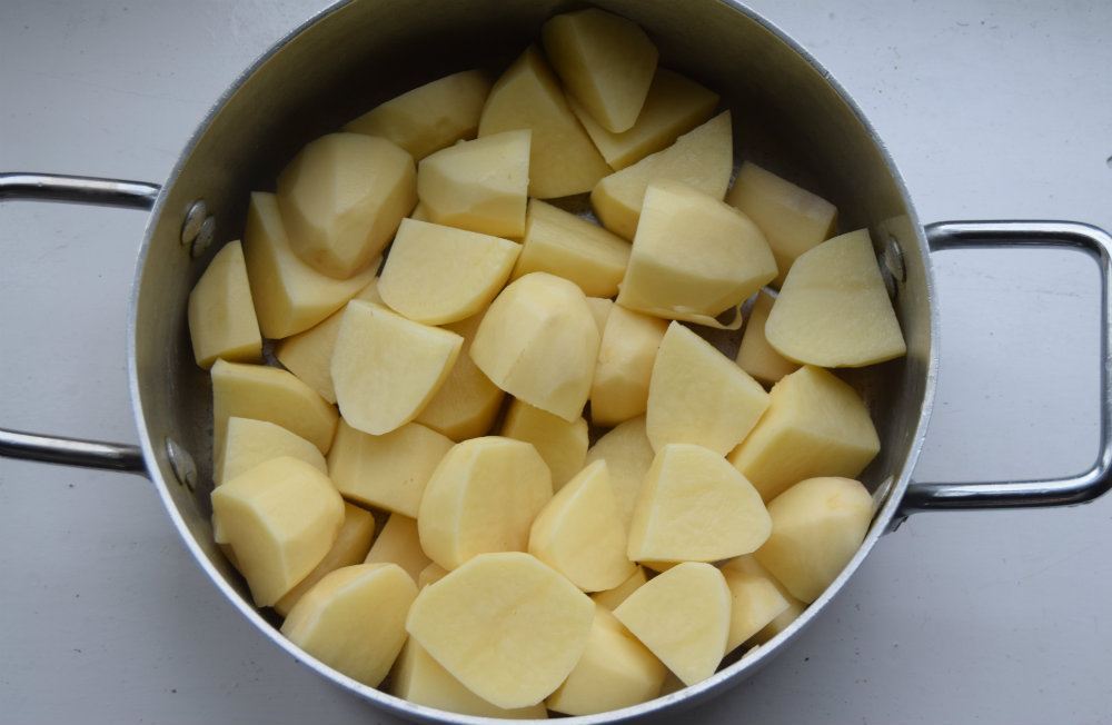 . سیب زمینی ها را به اندازه های مساوی 7-8 سانتی متر برش دهید، سپس آنها را آبکشی کنید تا نشاسته زائد از بین برود و بعد در تابه ای با آب سرد و مقداری نمک بریزید. سیب زمینی ها باید کاملاً با آب پوشانده شوند.