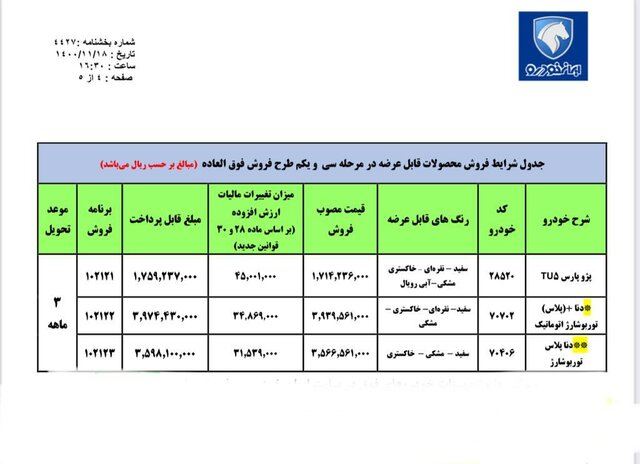 در راستای اجرای طرح فروش محصولات گروه صنعتی ایرانخودرو به صورت هفتگی در سهشنبهها، این هفته سی و یکمین مرحله از طرح فروش فوقالعاده محصولات این شرکت برای سه محصول پژو پارس tu۵، دناپلاس توربوشارژر اتوماتیک و دستی اجرا میشود.