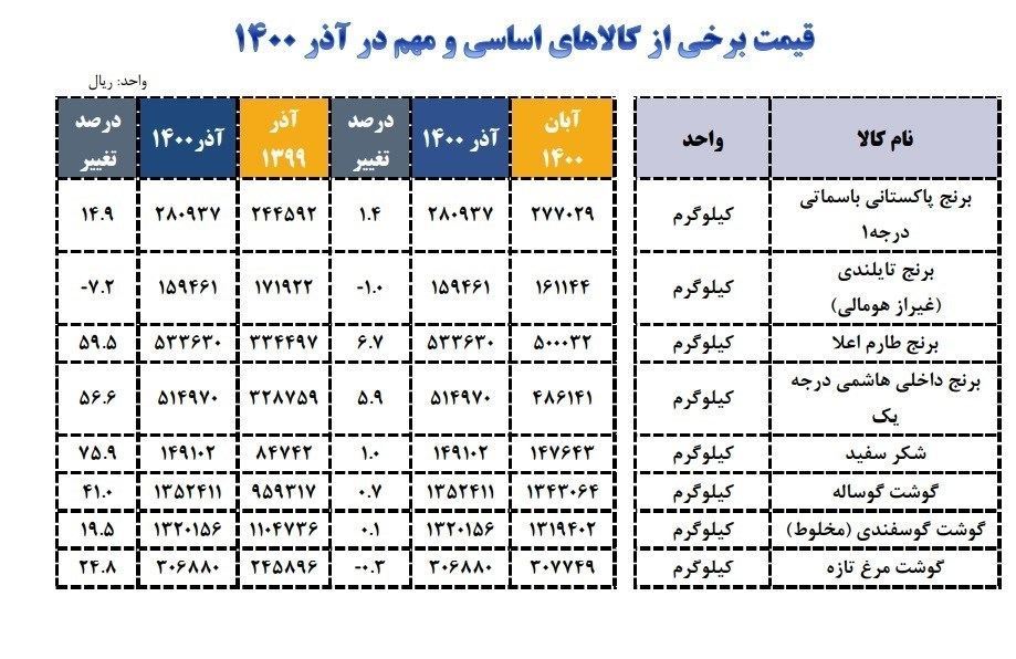علاوه بر این برنج 59.5 درصد، گوشت گوساله 41 درصد، گوشت گوسفندی 19.5 درصد، گوشت مرغ 24.8 درصد رشد قیمت را در آذرماه امسال نسبت به مدت مشابه درسال گذشته ثبت کرده است.