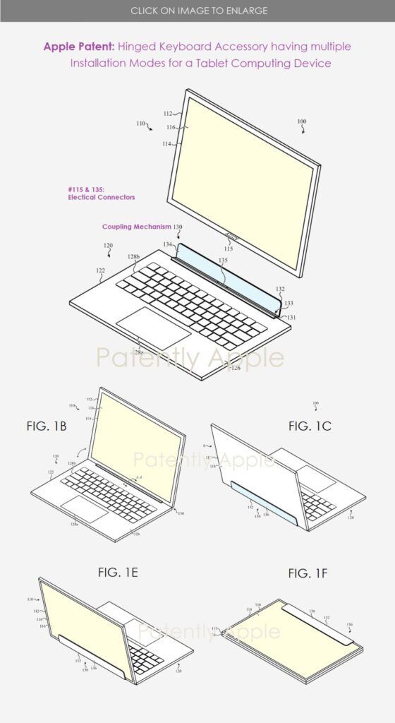 اپل قبلا ایده شبیه شدن آیپد به مک بوک را رد کرده بود، اما فناوریهای جدید، ممکن است این شرکت را در موقعیتی قرار دهند که چنین ایدهای را پیاده کند. طرح اولیه مذکور یک نگاه اجمالی جذاب به مسیر احتمالی آینده اپل است. این طرح یک سیستم پایه با صفحه کلید الکترومکانیکی و یک جفت لولا را توصیف میکند که میتواند در حالتهای مختلف از جمله لپ تاپ و حالت نمایش معکوس به iPad متصل شود. در موقعیت پایه، چندین دستگاه ورودی را میتوان به iPad متصل کرد از جمله صفحه کلید، پد لمسی، صفحه نمایش لمسی، اتصال مغناطیسی و شارژ بی سیم apple pen.