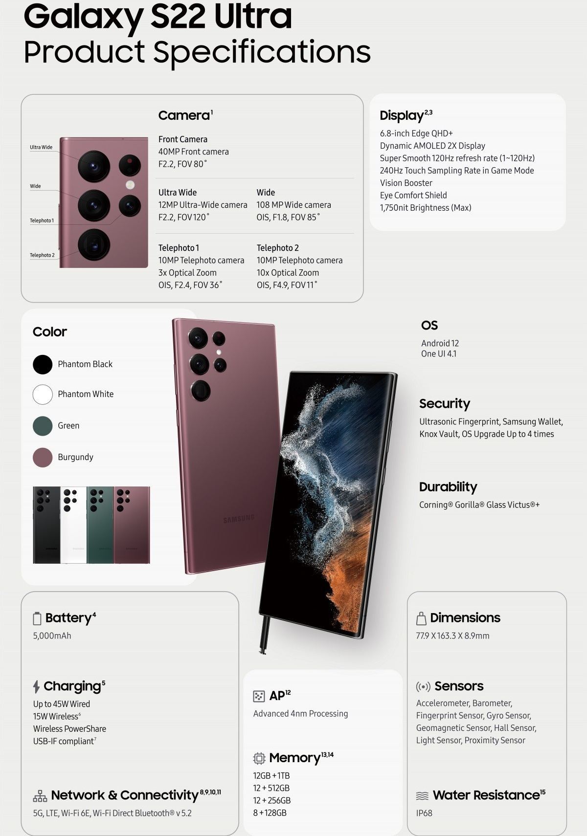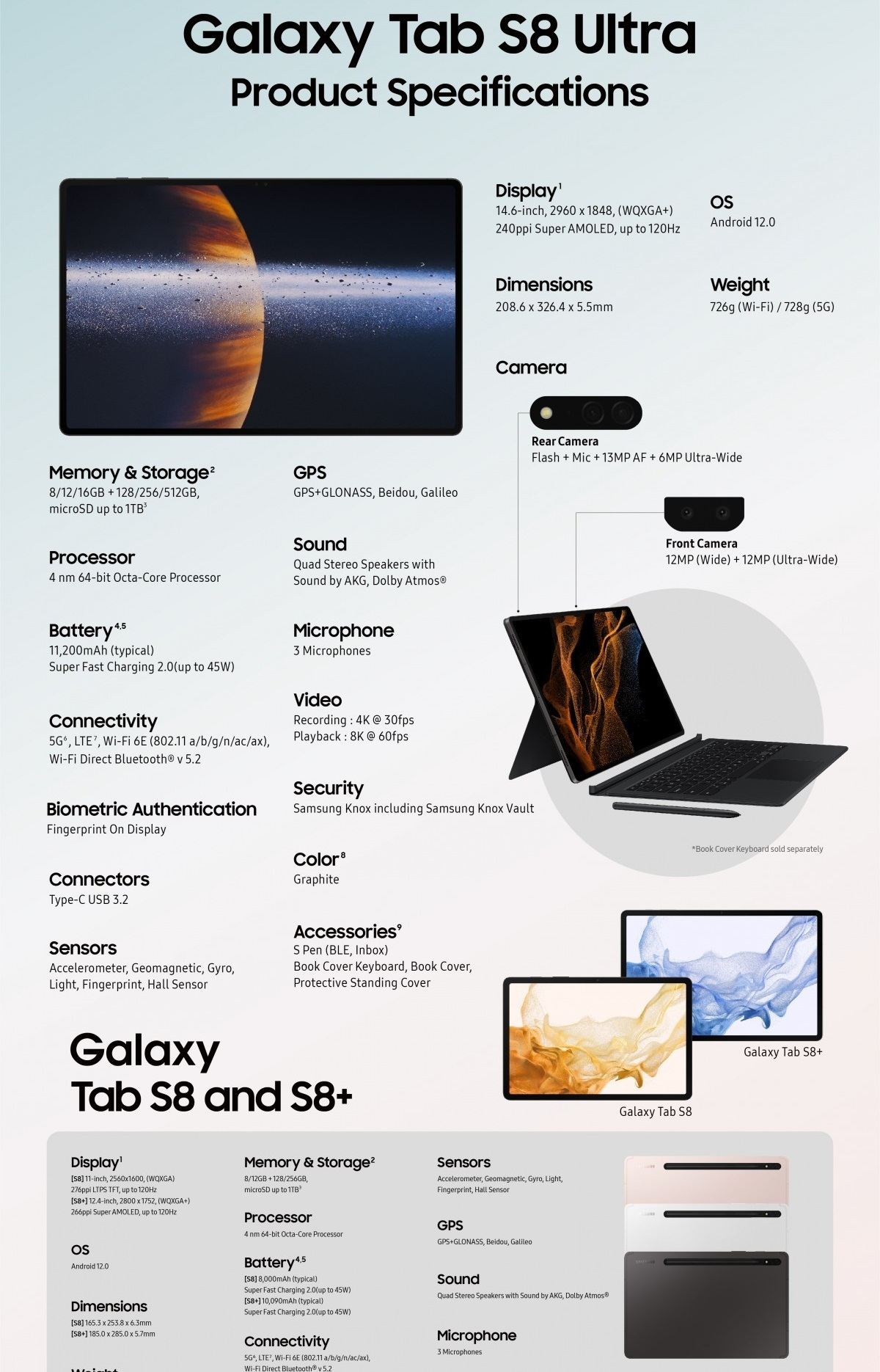 شرکت سامسونگ پس از پخش ویدئوهای تبلیغاتی درباره محصولاتش، چند اینفوگرافیک درباره آن‌ها منتشر کرده است. یکی از این اینفوگرافیک‌ها، ویژگی‌های گوشی هوشمند Galaxy S۲۲ Ultra را نشان می‌دهد. دومین اینفوگرافیک هم درباره قابلیت‌های تبلت‌های Galaxy Tab S۸ است.