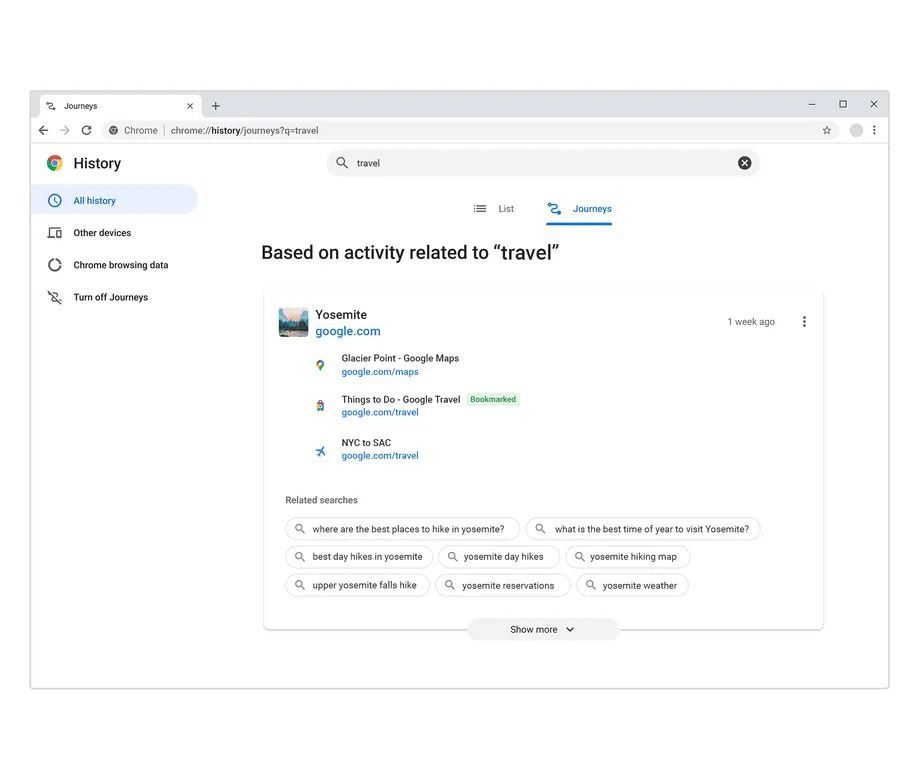 این سازوکار جدید خیلی راحتتر از جستجوی دستی در سوابق مرورگر، سایتهایی را به شما نشان میدهد که قبلا از آنها دیدن کردهاید. برای مثال اگر کلمه مریخ را بنویسید، میتوانید فهرست همه صفحاتی را ببینید که مربوط به مریخ بودهاند. قابلیت Journeys عمدتا صفحاتی را نشان میدهد که بیشترین زمان را در آنها صرف کردهاید. بهعلاوه، بر اساس جستجوهای شما پیشنهادهای بیشتری برایتان ارائه میشود.