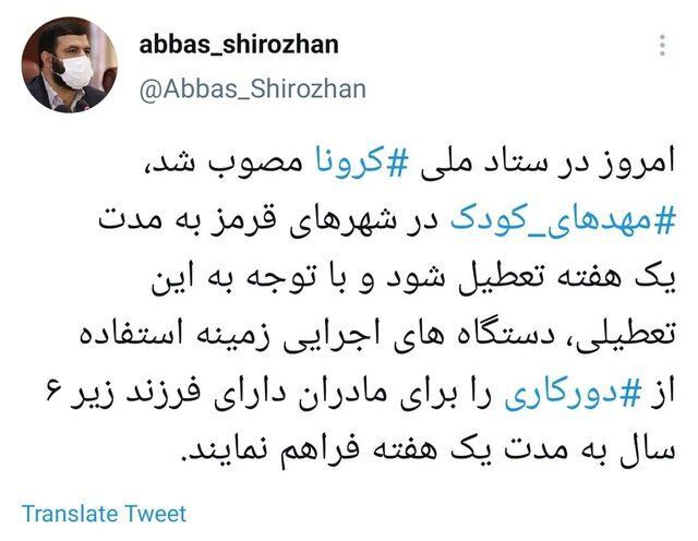 به گزارش سایت طلا ، دکتر عباس شیراوژن در پیامی توییتری، مصوبات جلسه امروز ستاد ملی مقابله با کرونا را به این شرح اعلام کرد: «امروز در ستاد ملی کرونا مصوب شد، مهدهای کودک در شهرهای قرمز به مدت یک هفته تعطیل شود و با توجه به این تعطیلی، دستگاه های اجرایی زمینه استفاده از دورکاری را برای مادران دارای فرزند زیر ۶ سال به مدت یک هفته فراهم نمایند.