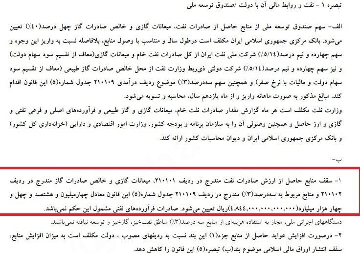 این درحالی است که در کمیسیون تلفیق بودجه در مجلس شورای اسلامی، سقف منابع حاصل از صادرات نفت مندرج در ردیف 210101، میعانات گازی و خالص صادرات گاز مندرج در ردیف 21012 و منابع سهدرصدی ردیف 210109 قانون بودجه 484 هزار میلیارد تومان تعیین شده است، متن مصوبه تلفیق در ادامه قابل رؤیت است؛